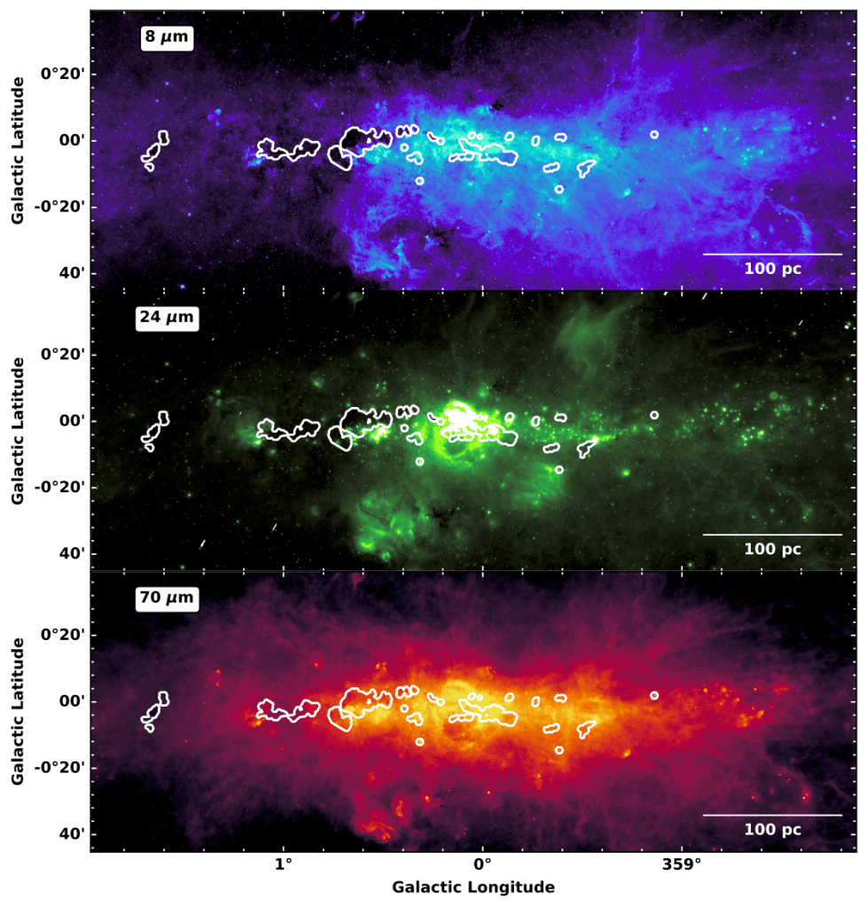 From Hatchfield et al. 2024: A threefold view of our Galactic Center, at 8 microns (top) and 24 microns (middle) from the Spitzer Space Telescope, and at 70 microns (bottom) from the Herschel Space Observatory. Different features of the gas appear at different frequencies, with hotter material generally shining at shorter wavelengths and the colder, dense gas structures glowing more in the far infrared detected by Herschel. The CMZoom survey footprint is overlaid in white, showing the regions searched for dense gas structures by our team’s cataloging effort (Battersby et al. 2020, Hatchfield et al 2020, Callanan et al 2023). A Position Velocity Diagram (PV diagram) of the Galactic Center in a hydrodynamic simulation of the Milky Way.